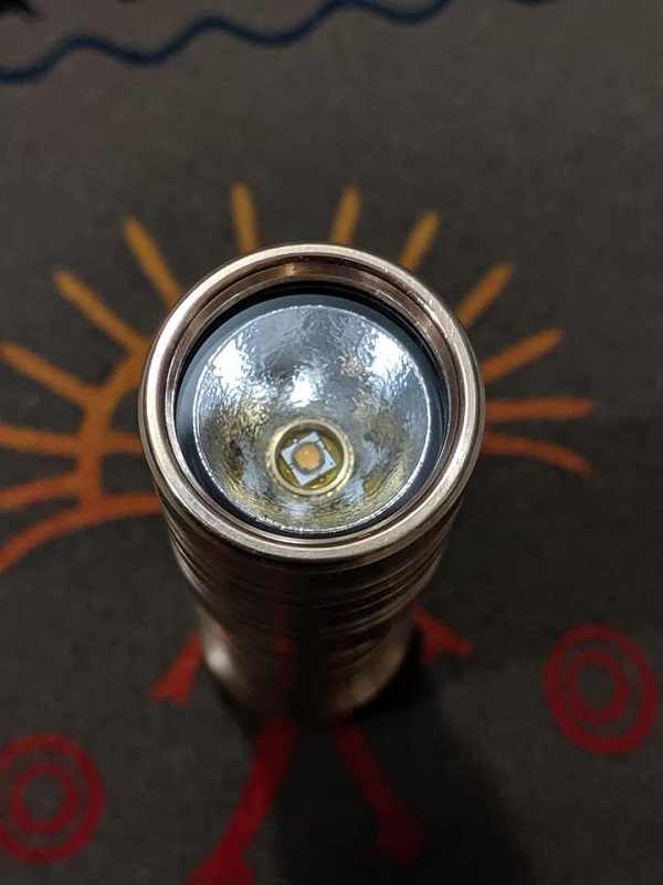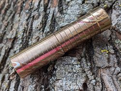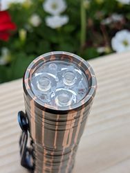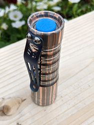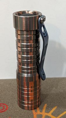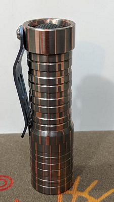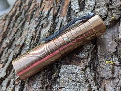 3 color straight grain mokume. Copper, Brass, Nickel Silver. Single emitter with 20mm reflector.