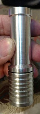 Solid Nickel 201 Body, Damascus mule head. SF E Series compatible threads. Uses McGizmo style engine. Killed the lathe twice on the Nickel 201. Sort of the turning point. If I wanted to keep going, I needed to do something about the lathe I was using. Go Big or Go home right? Since this isn't the last on the list, we know what happened :)