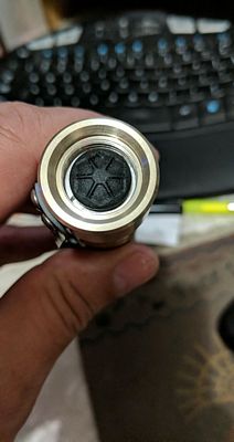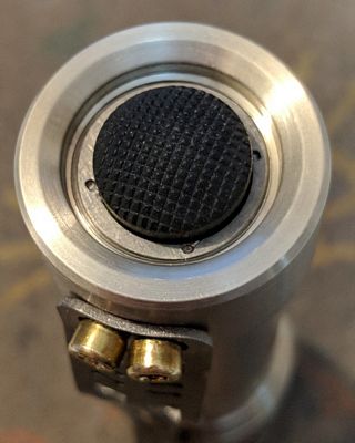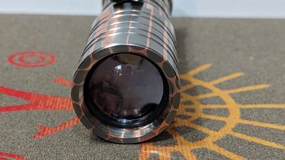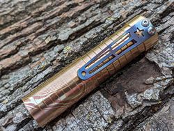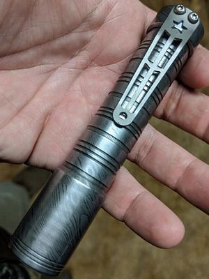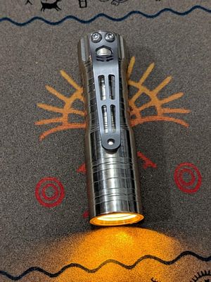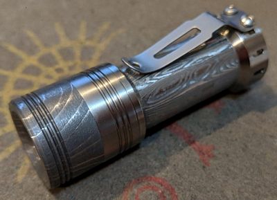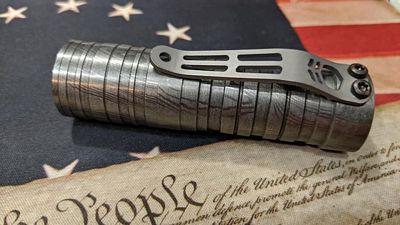 Another one where I just made the head. I had a small piece of the original Del Ealy Damascus from the Mr. Bulk DamCham run, and a small piece of Ti, and I decided to create a 2 metal head to go along with the 2 metal Tain Nova body that it's paired with. Uses a McGizmo style engine and a reflector I cut down to fit the small head.