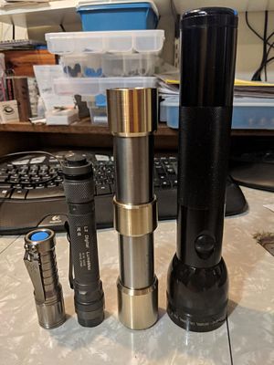 Ti/Aluminum bronze "the pounder". Empty host with no electronics weighs in at 1lb 3.3oz.! 2x 26500 batteries, pushing a 3000k xp-l HI Lux-RC 371d driver. Deuce grip, and various Deuce themes with the rest of the machining. Size comparison shown with other know lights