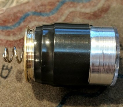 the drop in was chucked up in a lathe, then carefully trimmed at the base, just above the bottom brass contact plate to create a gap, and the large rim on top was removed down to the optic nearly. it was mostly loose in this picture. only a small section remained intact that was less than paper thin. |
