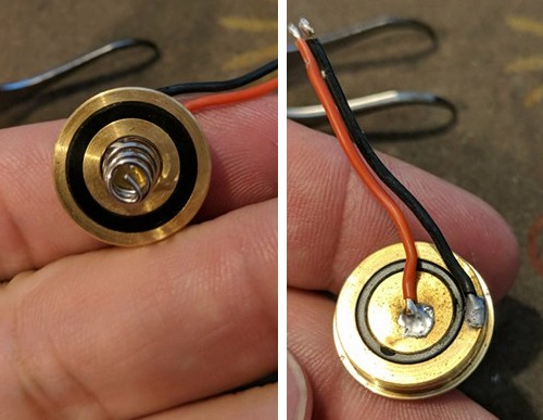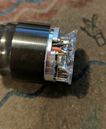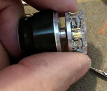 I then desoldered the contacts on the board, and inserted a screw driver into the slot between the contact plate and the pill, and twisted. did this aroound the circumference of the drop in to pull the contact plate off, which was a very nice press fit into place. |