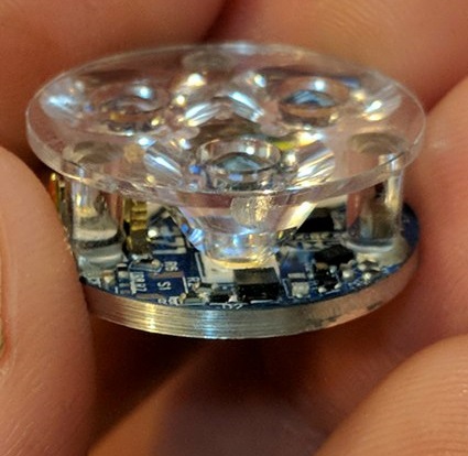 here with the paper thin remnant slipped off the assembly. optic and board are epoxied onto the pill. the optic and board need to stay permanently as one unit to not risk damage to the board. |